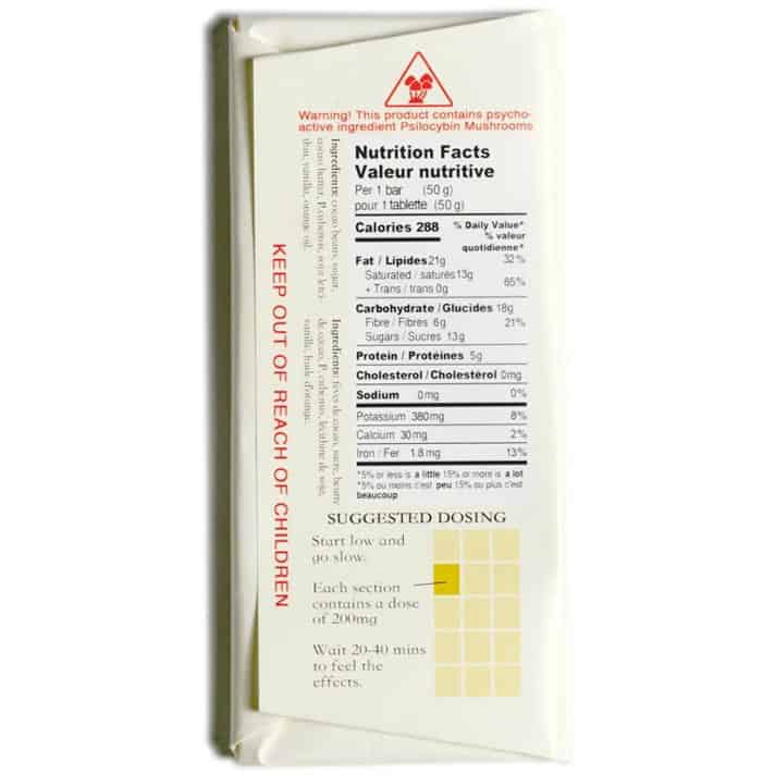 50 gram Dark Chocolate Bar with 3 grams of Golden Teacher Magic Mushrooms per chocolate bar.