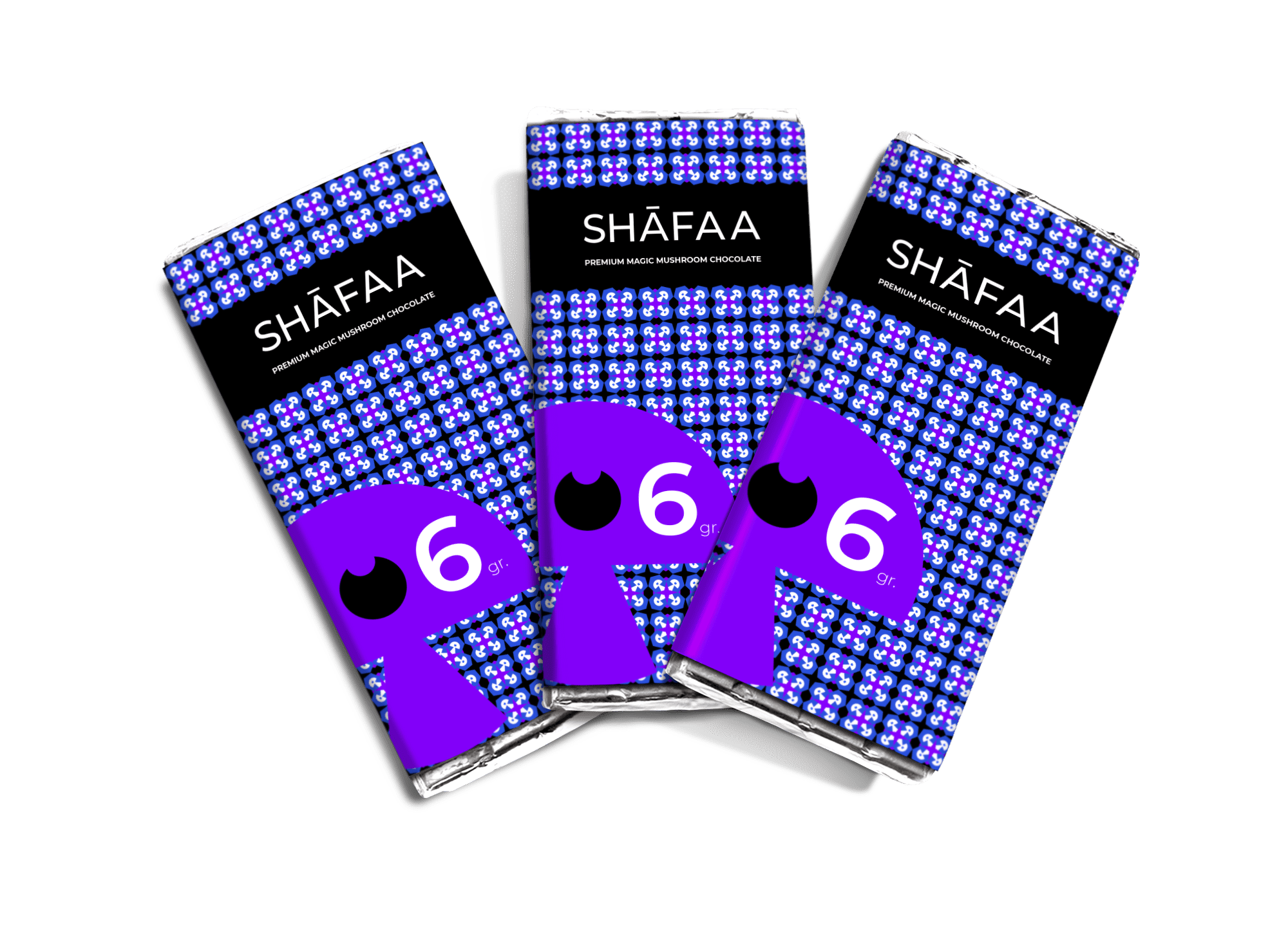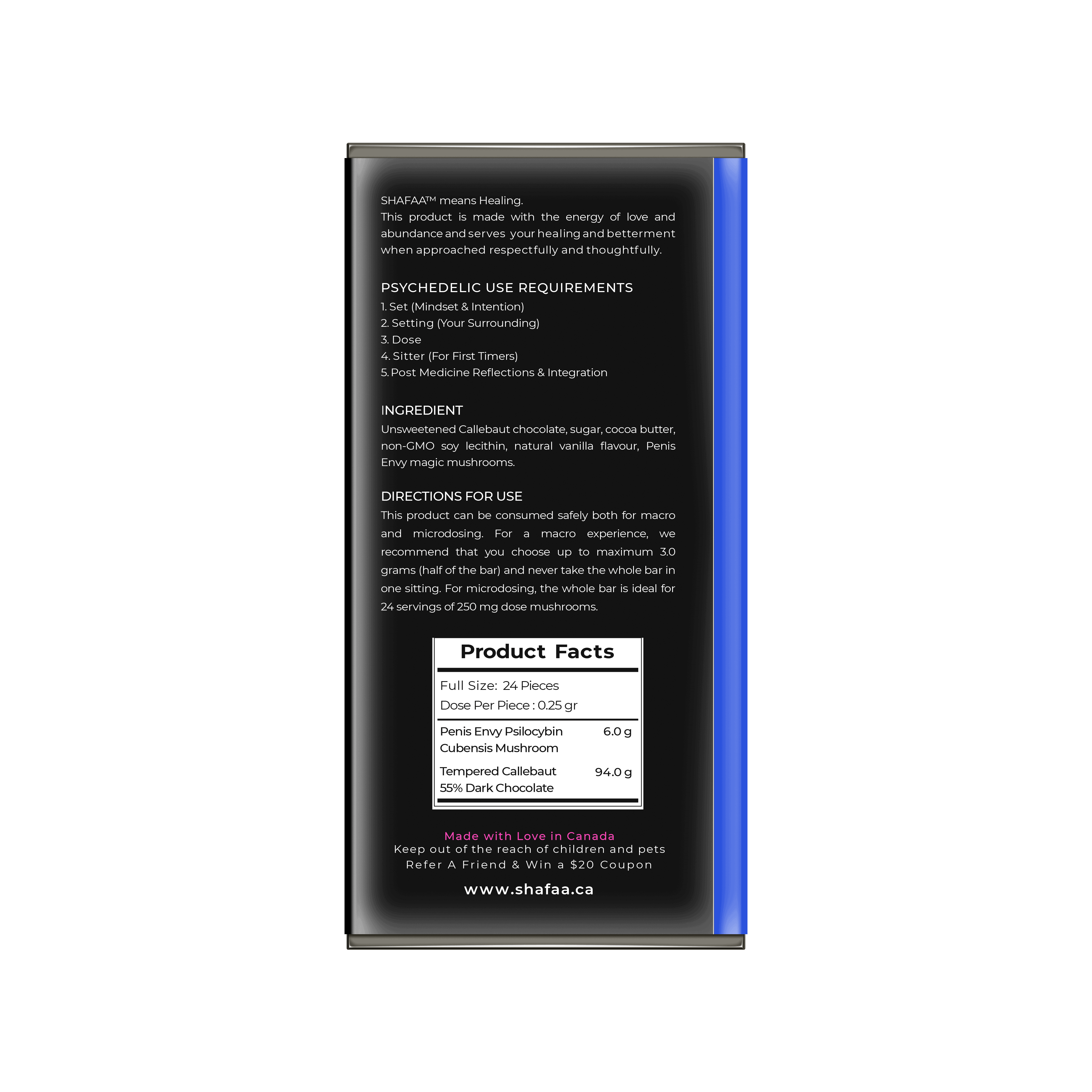 Using Callebaut chocolate, SHAFAA maximizes potency while avoiding the powdered texture and taste of mushrooms. Each 100g bar contains 6g of Penis Envy magic mushrooms and 94g of 55% dark chocolate, divided into 24 breakable pieces. Each piece contains 250mg (0.25g) of mushrooms, making it easy to customize your dosage for both macrodosing and microdosing regimens.
