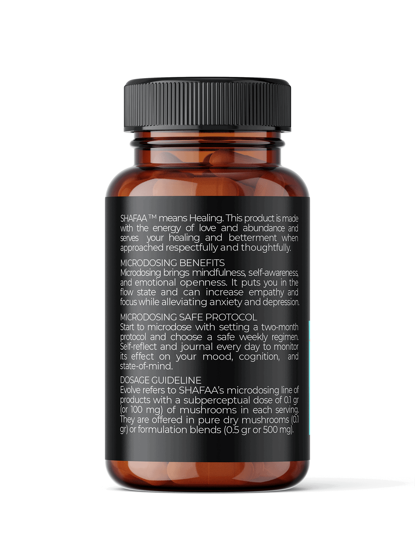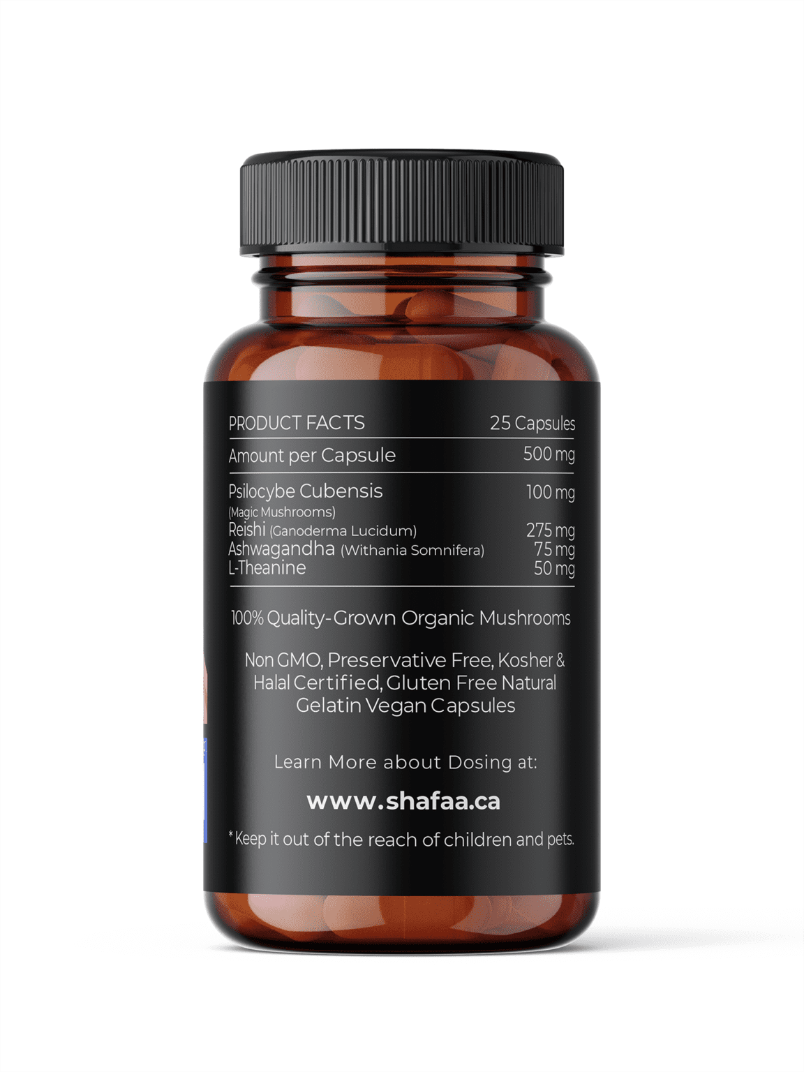Each bottle of SHAFAA’s Microdosing Shrooms Capsules Balance Blend contains 25 vegan capsules, each with 500mg (0.5g) of a potent blend of magic mushrooms, Reishi, Ashwagandha, and L-Theanine. These tasteless capsules are easy to take, making it simple to incorporate them into your daily routine.